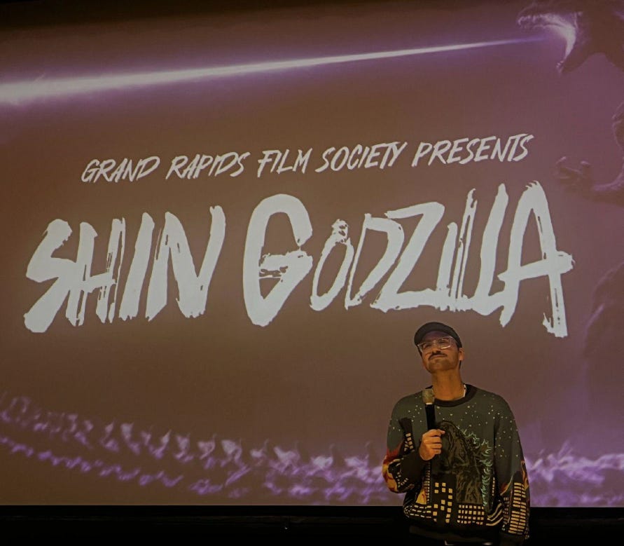 2025 was an interesting year in my life as it felt like the first time I “struggled” with cinema. For the past five years or so, cinema evolved from a passive interest to something that, for a brief time, I could call a job. It became a unifying medium between my passion for creating art and my desire to work in a space that would foster and reward creativity. As I’ve grown older beyond my college years, those days of being able to carve out entire weekends to work on a friend’s set or sit in a room workshopping ideas for my own project with amazing colleagues or professors have begun to fade. In this year of soul-searching, I had truly thought that I needed to leave cinema behind as I became unable to separate myself from the growing terror I had after the 2025 presidential inauguration. I left behind a career in news practically devoid of creativity, and thought that it was the start of my transition away from the creative thrill that filmmaking brought me. That feeling changed rapidly, however, when I was not just informed of a Grand Rapids Film Society screening of the anniversary edition of 2016’s Shin Godzilla — but also asked to introduce it.